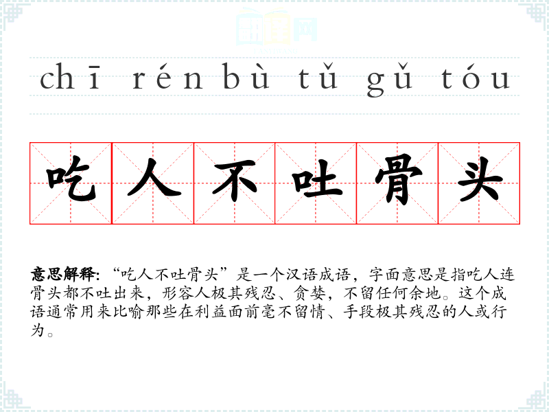 “吃人不吐骨头”是一个汉语成语,字面意思是指吃人连骨头都不吐出来,形容人极其残忍、贪婪,不留任何余地。这个成语通常用来比喻那些在利益面前毫不留情、手段极其残忍的人或行为。