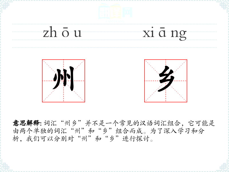词汇“州乡”并不是一个常见的汉语词汇组合,它可能是由两个单独的词汇“州”和“乡”组合而成。为了深入学*和分析,我们可以分别对“州”和“乡”进行探讨。