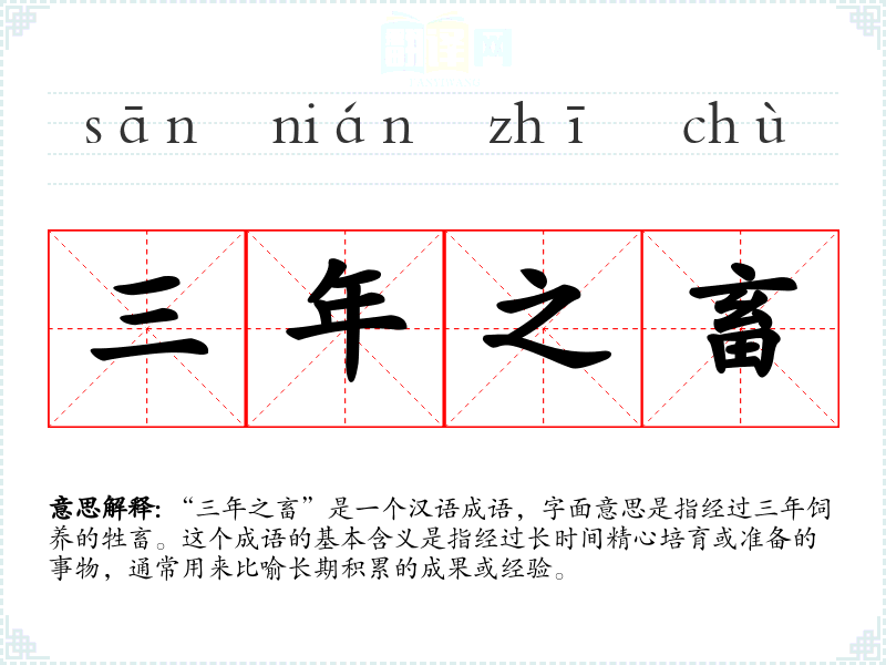 “三年之畜”是一个汉语成语,字面意思是指经过三年饲养的牲畜。这个成语的基本含义是指经过长时间精心培育或准备的事物,通常用来比喻长期积累的成果或经验。
