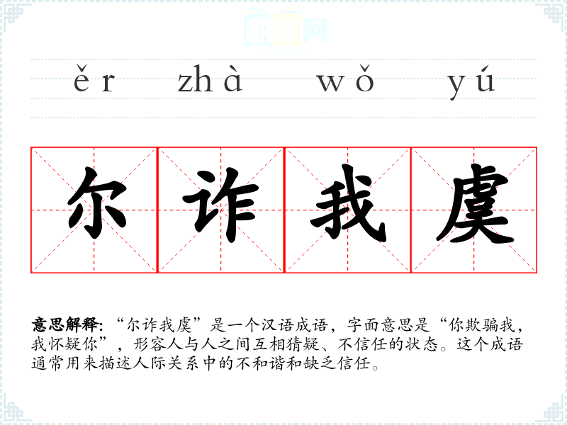 “尔诈我虞”是一个汉语成语,字面意思是“你欺骗我,我怀疑你”,形容人与人之间互相猜疑、不信任的状态。这个成语通常用来描述人际关系中的不和谐和缺乏信任。