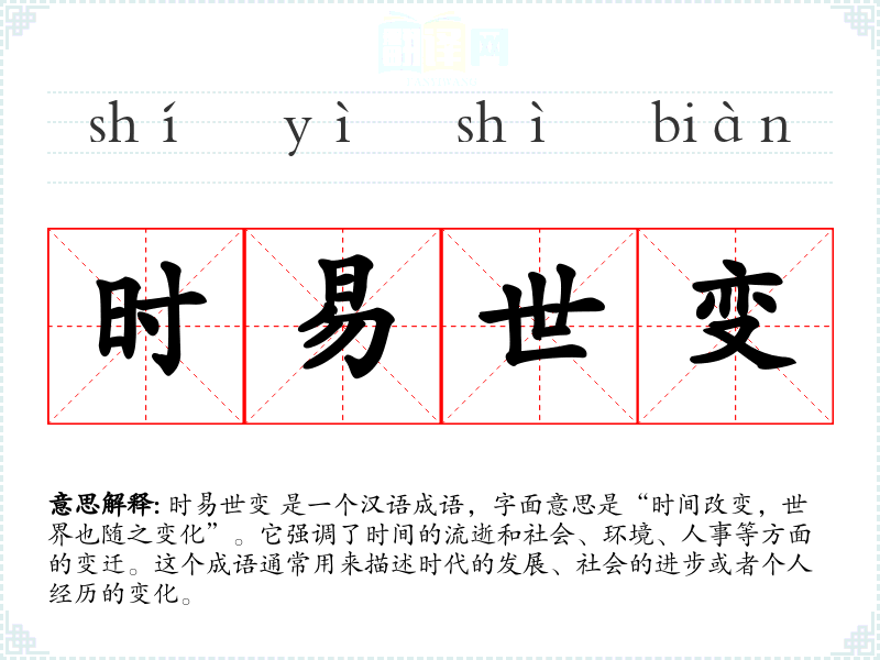 时易世变这个成语深刻地反映了时间和变化的主题,无论是在文学、历史还是日常生活中,都是一个非常有用的表达。它提醒我们珍惜当下,适应变化,同时也让我们对历史和文化有更深的理解和尊重。