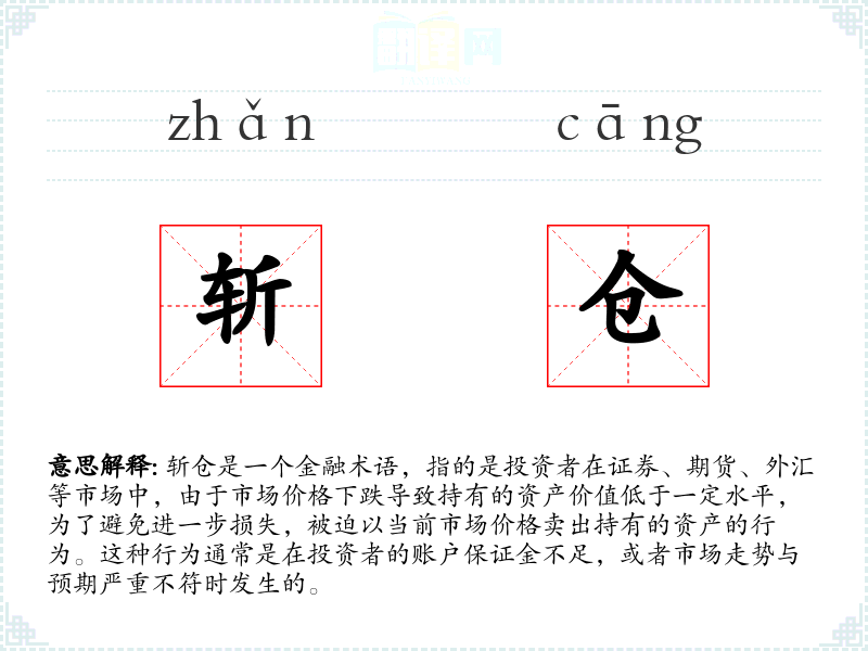 在英语中,斩仓可以对应为“liquidate a position”或“cut losses”,这些表达也体现了在不利市场条件下的紧急卖出行为。