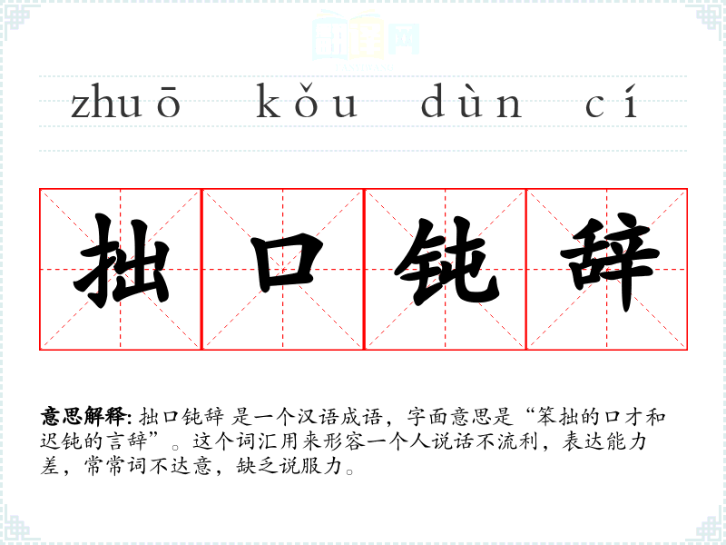 拙口钝辞 是一个汉语成语,字面意思是“笨拙的口才和迟钝的言辞”。这个词汇用来形容一个人说话不流利,表达能力差,常常词不达意,缺乏说服力。
