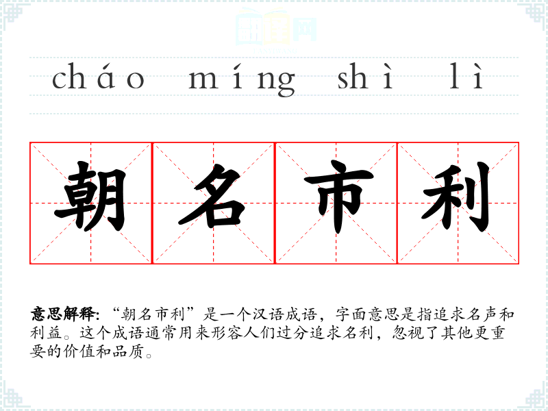 “朝名市利”是一个汉语成语,字面意思是指追求名声和利益。这个成语通常用来形容人们过分追求名利,忽视了其他更重要的价值和品质。