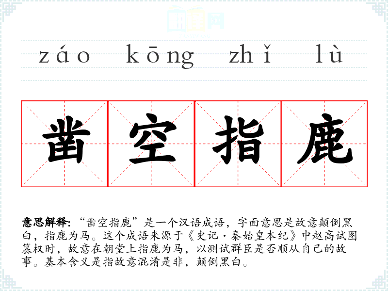 “凿空指鹿”源自《史记·秦始皇本纪》中的故事,赵高在朝堂上指鹿为马,以测试群臣的忠诚。这个成语自汉代以来就被广泛使用,用来形容故意颠倒黑白的行为。