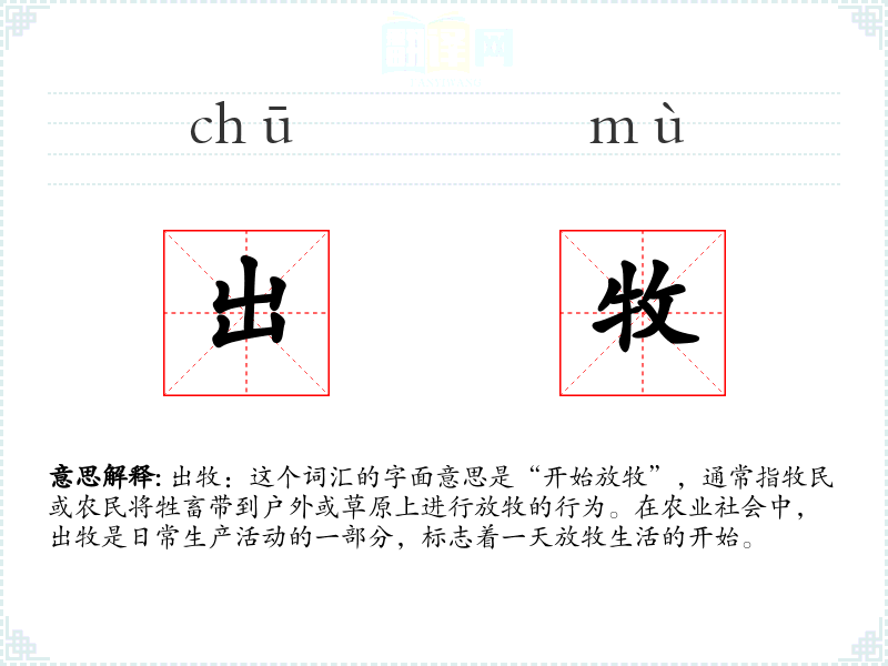 出牧:这个词汇的字面意思是“开始放牧”,通常指牧民或农民将牲畜带到户外或草原上进行放牧的行为。在农业社会中,出牧是日常生产活动的一部分,标志着一天放牧生活的开始。