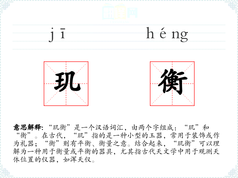- 反义词:无(由于“玑衡”是一个特定领域的术语,通常没有直接的反义词)