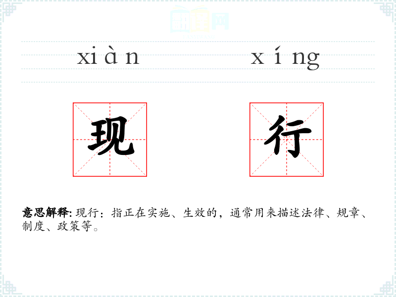 - 专业领域:在法律、政治、经济等领域,现行常用来指代正在执行的法规或政策,如“现行的税法”。