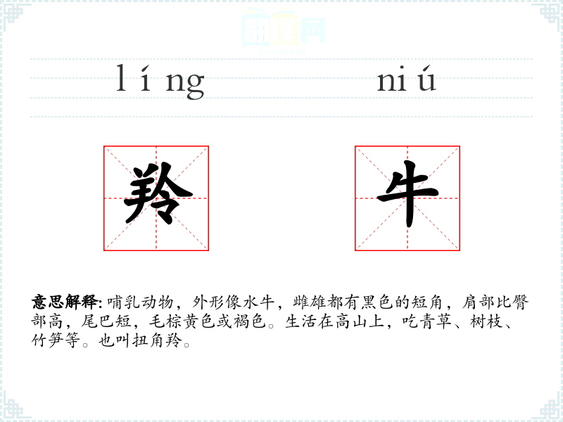 哺乳动物,外形像水牛,雌雄都有黑色的短角,肩部比臀部高,尾巴短,毛棕黄色或褐色。生活在高山上,吃青草、树枝、竹笋等。也叫扭角羚。
