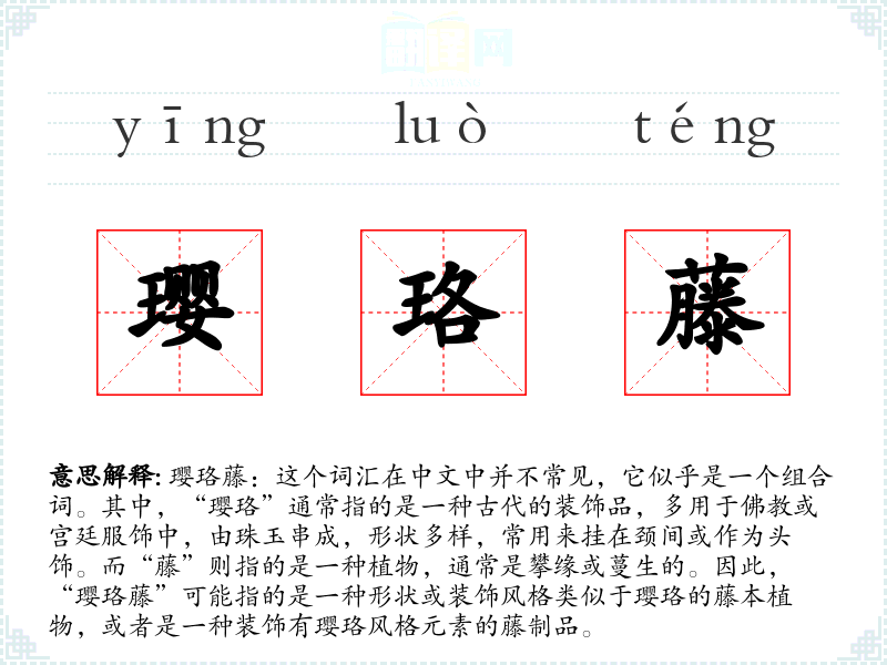 由于“璎珞藤”是一个较为特定的中文词汇,它在其他语言或文化中可能没有直接对应的词汇。在西方文化中,类似的装饰风格可能被称为“珠链藤”或“装饰藤”。