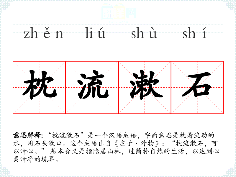 “枕流漱石”是一个汉语成语,字面意思是枕着流动的水,用石头漱口。这个成语出自《庄子·外物》:“枕流漱石,可以清心。” 基本含义是指隐居山林,过简朴自然的生活,以达到心灵清净的境界。
