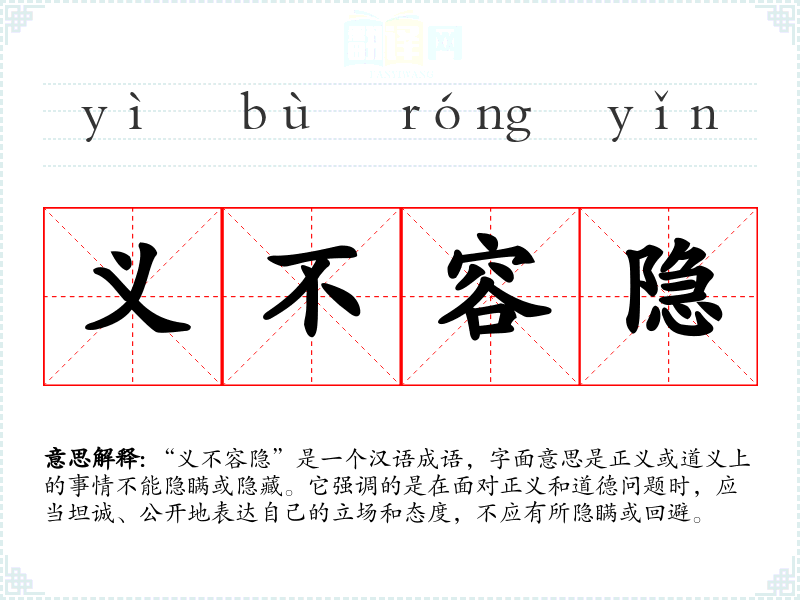 “义不容隐”是一个汉语成语,字面意思是正义或道义上的事情不能隐瞒或隐藏。它强调的是在面对正义和道德问题时,应当坦诚、公开地表达自己的立场和态度,不应有所隐瞒或回避。