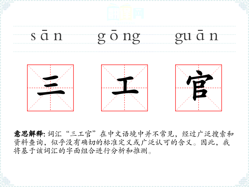 词汇“三工官”在中文语境中并不常见,经过广泛搜索和资料查询,似乎没有确切的标准定义或广泛认可的含义。因此,我将基于该词汇的字面组合进行分析和推测。