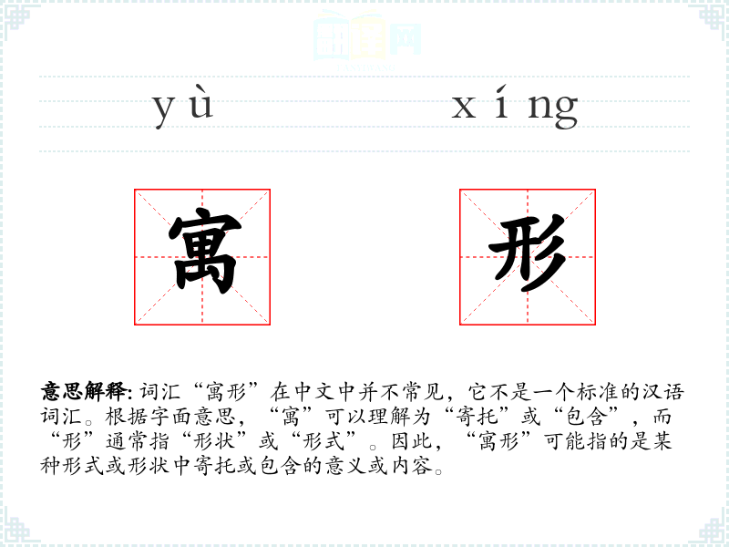 词汇“寓形”在中文中并不常见,它不是一个标准的汉语词汇。根据字面意思,“寓”可以理解为“寄托”或“包含”,而“形”通常指“形状”或“形式”。因此,“寓形”可能指的是某种形式或形状中寄托或包含的意义或内容。
