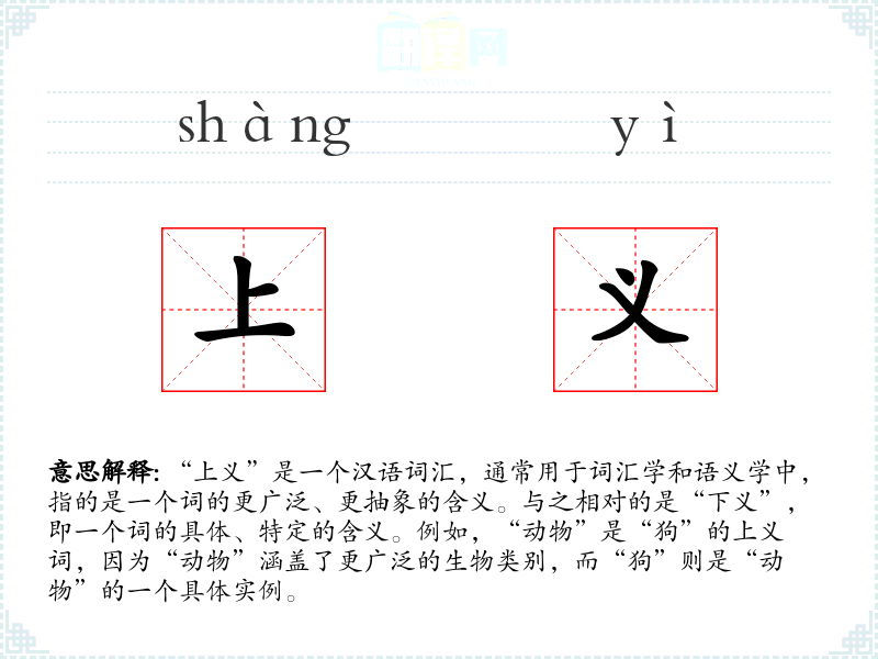 - 专业领域:在词汇学或语义学的学术讨论中,“上义”是一个重要的概念,用于分析和理解词汇的层次结构。