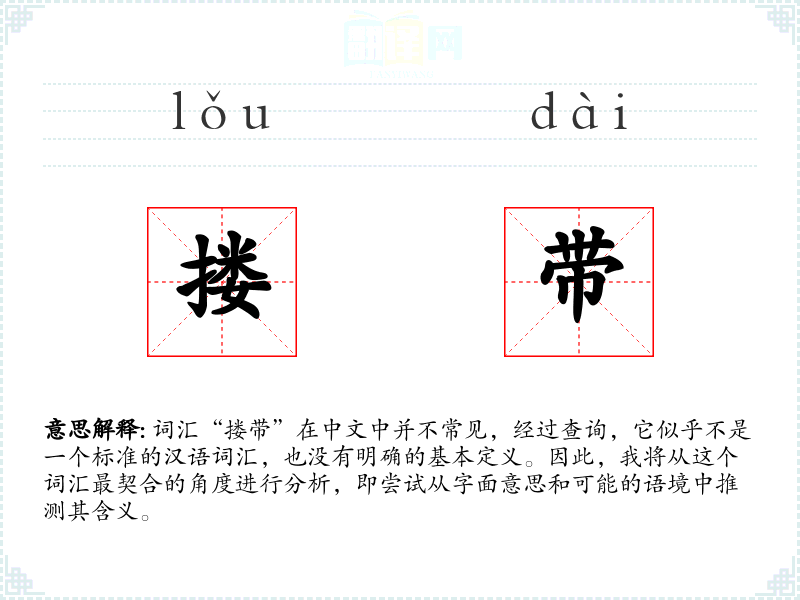词汇“搂带”在中文中并不常见,经过查询,它似乎不是一个标准的汉语词汇,也没有明确的基本定义。因此,我将从这个词汇最契合的角度进行分析,即尝试从字面意思和可能的语境中推测其含义。