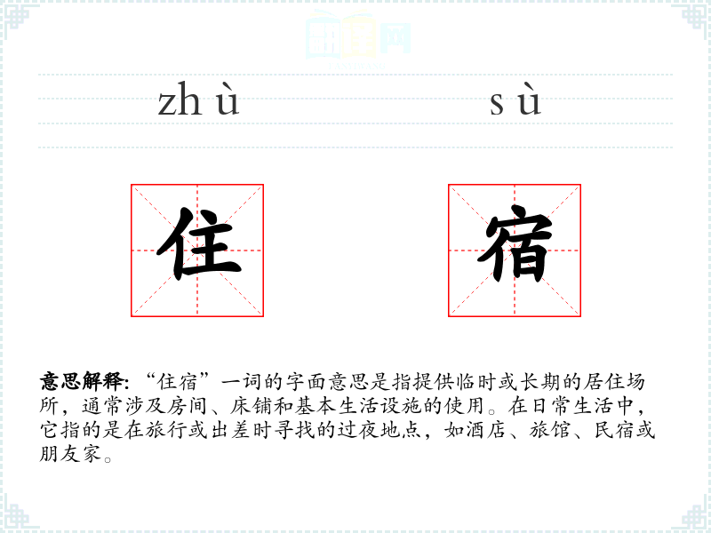 “住宿”一词由“宿”和“住”两个字组成,其中“宿”原指夜晚的停留,而“住”指长期居住。在古代汉语中,“宿”常用于军事或旅行的语境中,表示临时停留。随着时间的推移,“住宿”逐渐成为指代提供临时居住服务的通用词汇。