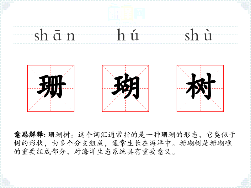 - 口语:在日常对话中,人们可能用“珊瑚树”来形容某种物品或装饰品的外观,如“这个花瓶的形状像一棵珊瑚树”。