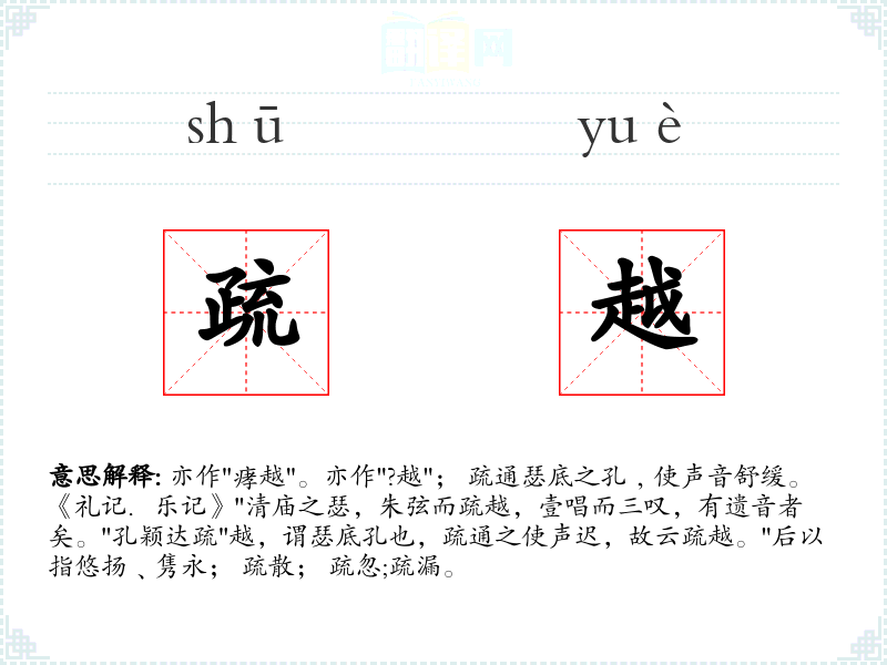 1.亦作"痚越"。亦作"?越"; 疏通瑟底之孔﹐使声音舒缓。《礼记.乐记》"清庙之瑟,朱弦而疏越,壹唱而三叹,有遗音者矣。"孔颖达疏"越,谓瑟底孔也,疏通之使声迟,故云疏越。"后以指悠扬﹑隽永; 疏散; 疏忽;疏漏。