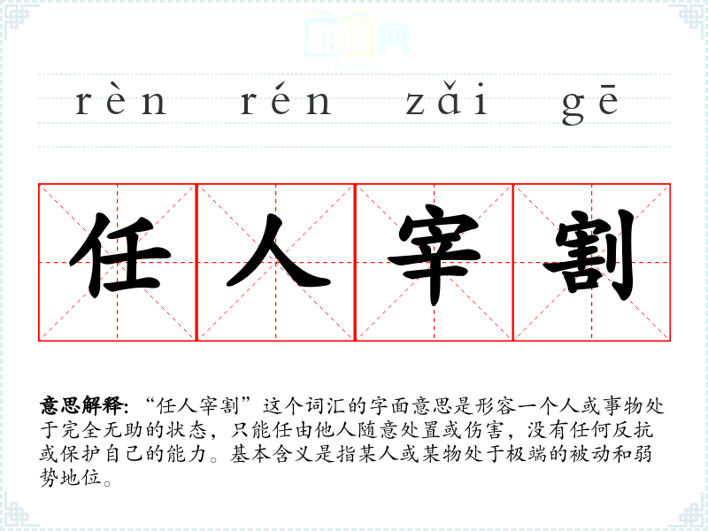 “任人宰割”这个词汇的字面意思是形容一个人或事物处于完全无助的状态,只能任由他人随意处置或伤害,没有任何反抗或保护自己的能力。基本含义是指某人或某物处于极端的被动和弱势地位。