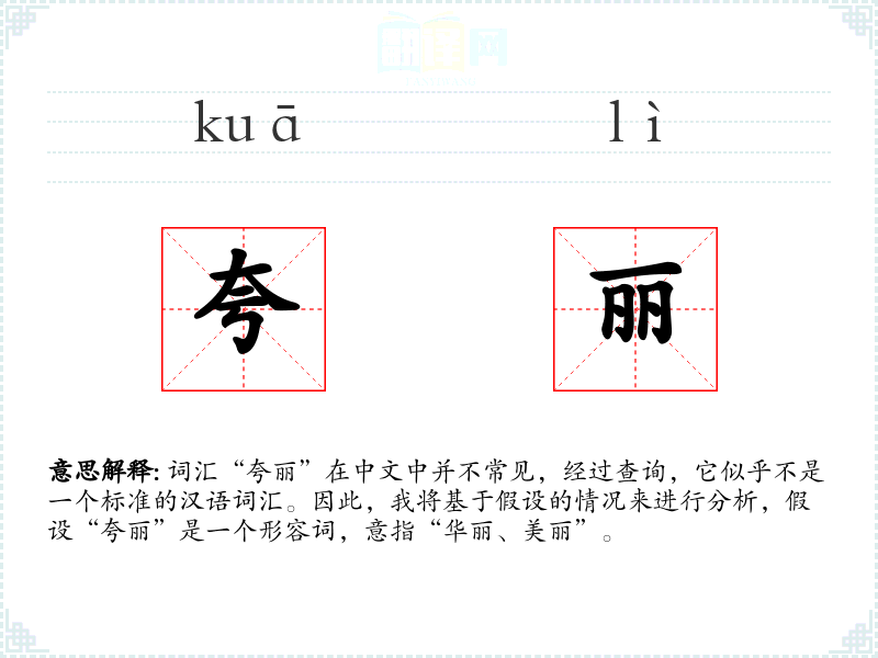 词汇“夸丽”在中文中并不常见,经过查询,它似乎不是一个标准的汉语词汇。因此,我将基于假设的情况来进行分析,假设“夸丽”是一个形容词,意指“华丽、美丽”。