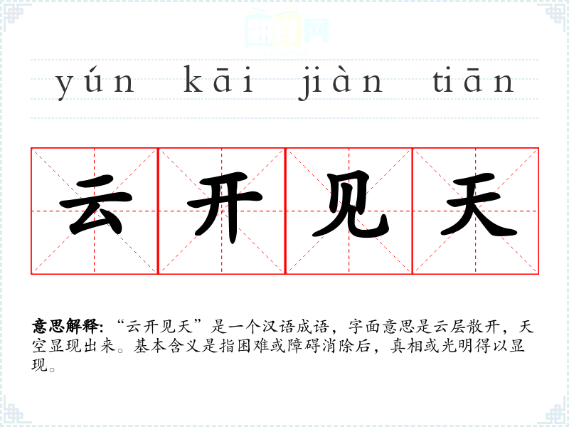 “云开见天”是一个汉语成语,字面意思是云层散开,天空显现出来。基本含义是指困难或障碍消除后,真相或光明得以显现。