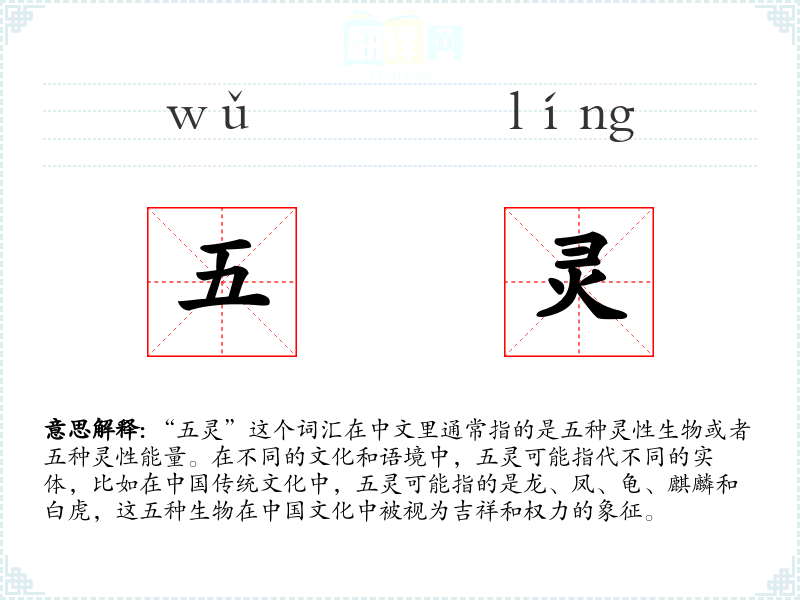 - 反义词:无(由于五灵通常指代正面的、吉祥的象征,因此较少有直接的反义词)