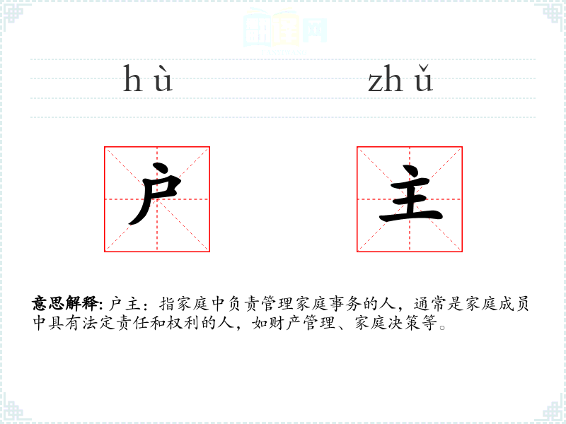 户主:指家庭中负责管理家庭事务的人,通常是家庭成员中具有法定责任和权利的人,如财产管理、家庭决策等。