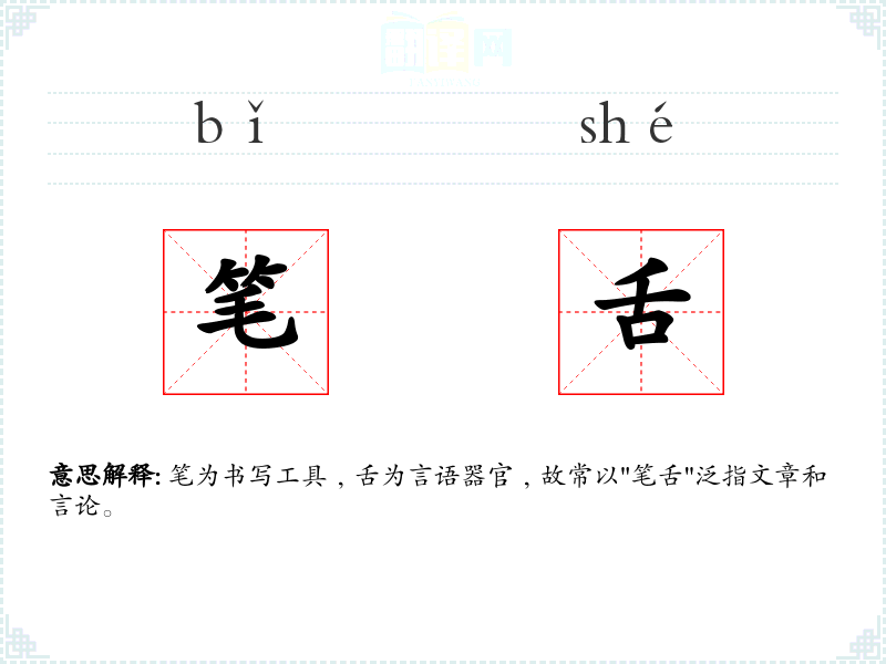 笔为书写工具﹐舌为言语器官﹐故常以"笔舌"泛指文章和言论。