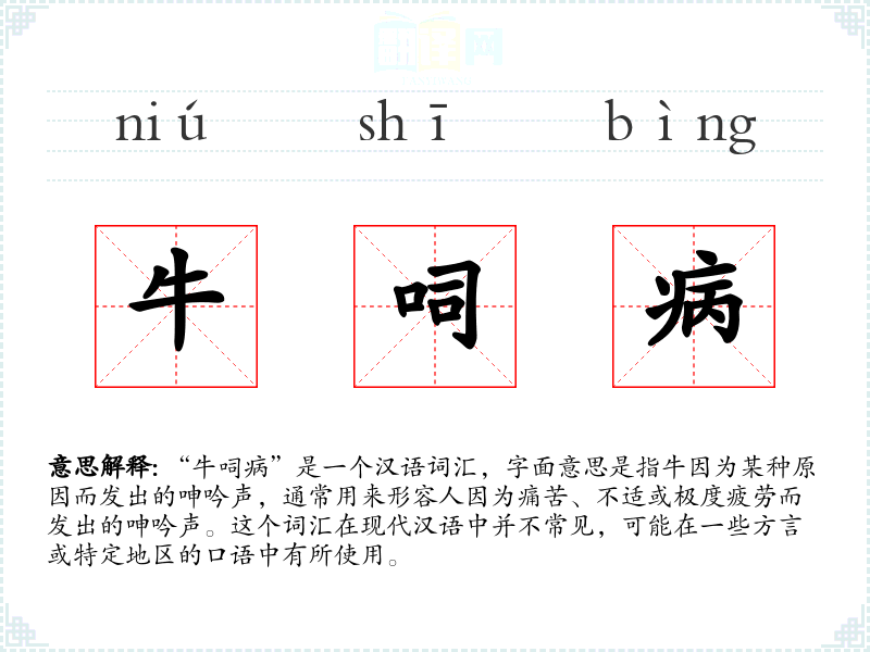 在其他语言中,可能没有直接对应“牛呞病”的词汇,但可以用类似的表达来形容人的痛苦状态,如英语中的“groan”或“moan”。