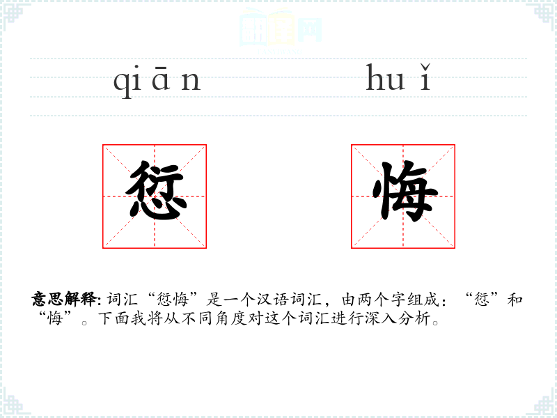 - 词源:“愆”源自古代汉语,意为过失;“悔”也源自古代汉语,意为后悔。