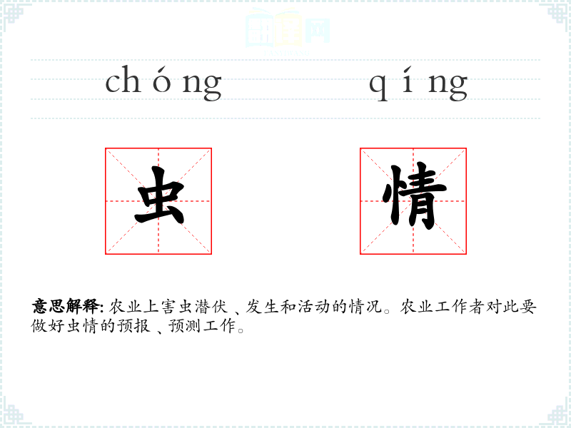农业上害虫潜伏﹑发生和活动的情况。农业工作者对此要做好虫情的预报﹑预测工作。