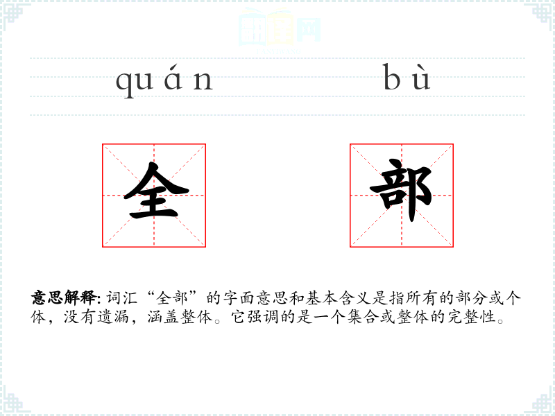 词汇“全部”的字面意思和基本含义是指所有的部分或个体,没有遗漏,涵盖整体。它强调的是一个集合或整体的完整性。