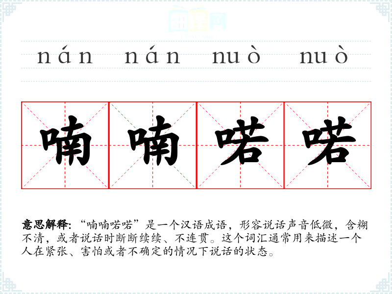 “喃喃喏喏”是一个汉语成语,形容说话声音低微,含糊不清,或者说话时断断续续、不连贯。这个词汇通常用来描述一个人在紧张、害怕或者不确定的情况下说话的状态。