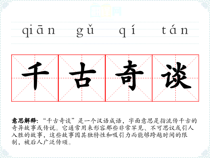 “千古奇谈”是一个汉语成语,字面意思是指流传千古的奇异故事或传说。它通常用来形容那些非常罕见、不可思议或引人入胜的故事,这些故事因其独特性和吸引力而能够跨越时间的限制,被后人广泛传颂。