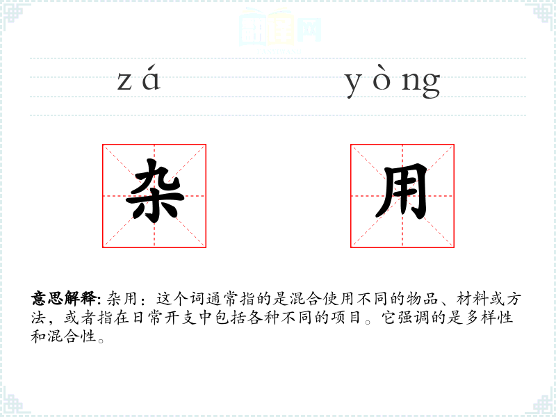 杂用:这个词通常指的是混合使用不同的物品、材料或方法,或者指在日常开支中包括各种不同的项目。它强调的是多样性和混合性。