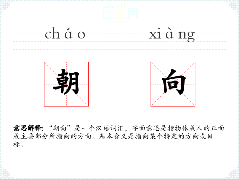 “朝向”由“朝”和“向”两个字组成,“朝”原指早晨,后引申为方向,“向”则直接表示方向。在古代汉语中,“朝”常与“向”连用,表示面向某个方向。