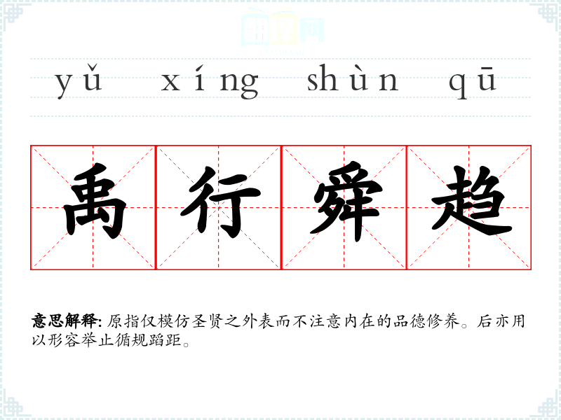 原指仅模仿圣贤之外表而不注意内在的品德修养。后亦用以形容举止循规蹈距。