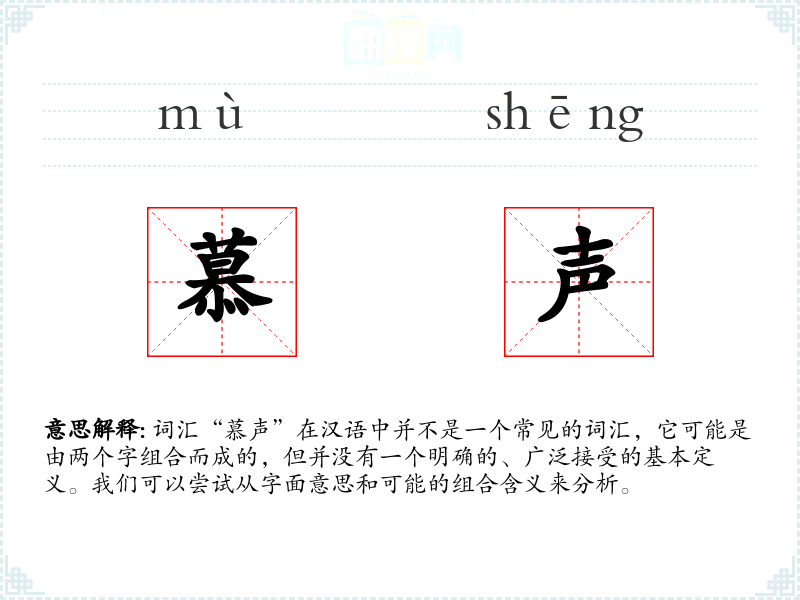 词汇“慕声”在汉语中并不是一个常见的词汇,它可能是由两个字组合而成的,但并没有一个明确的、广泛接受的基本定义。我们可以尝试从字面意思和可能的组合含义来分析。