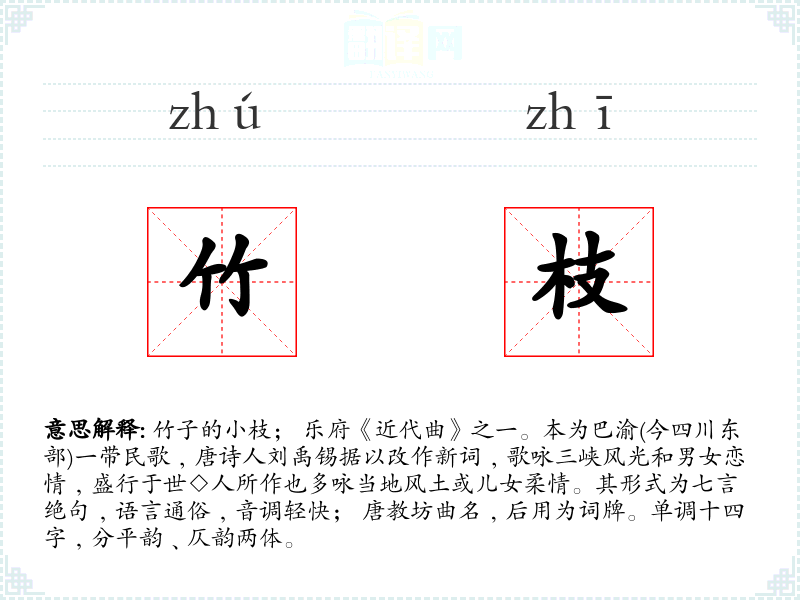 1.竹子的小枝; 乐府《近代曲》之一。本为巴渝(今四川东部)一带民歌﹐唐诗人刘禹锡据以改作新词﹐歌咏三峡风光和男女恋情﹐盛行于世◇人所作也多咏当地风土或儿女柔情。其形式为七言绝句﹐语言通俗﹐音调轻快; 唐教坊曲名﹐后用为词牌。单调十四字﹐分平韵﹑仄韵两体。
