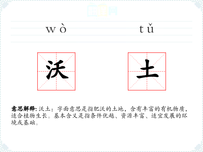 沃土:字面意思是指肥沃的土地,含有丰富的有机物质,适合植物生长。基本含义是指条件优越、资源丰富、适宜发展的环境或基础。