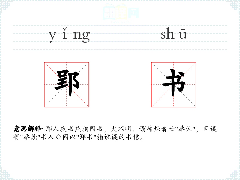 郢人夜书燕相国书,火不明,谓持烛者云"举烛",因误将"举烛"书入◇因以"郢书"指讹误的书信。