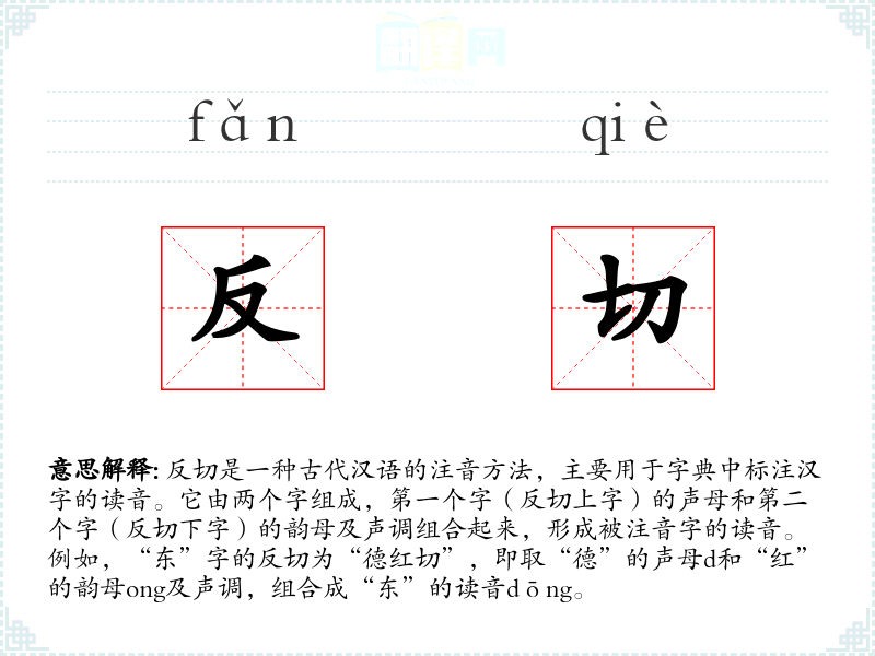 反切是一种古代汉语的注音方法,主要用于字典中标注汉字的读音。它由两个字组成,第一个字(反切上字)的声母和第二个字(反切下字)的韵母及声调组合起来,形成被注音字的读音。例如,“东”字的反切为“德红切”,即取“德”的声母d和“红”的韵母ong及声调,组合成“东”的读音dōng。