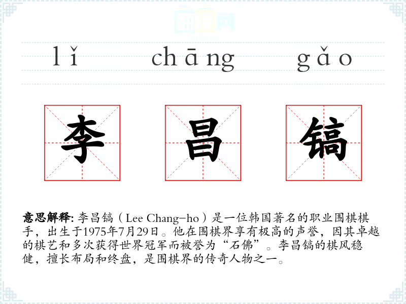 李昌镐(Lee Chang-ho)是一位韩国著名的职业围棋棋手,出生于1975年7月29日。他在围棋界享有极高的声誉,因其卓越的棋艺和多次获得世界冠军而被誉为“石佛”。李昌镐的棋风稳健,擅长布局和终盘,是围棋界的传奇人物之一。
