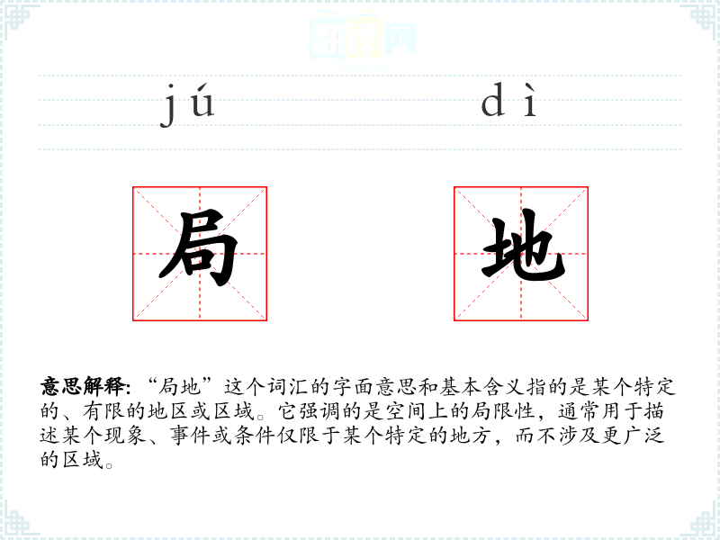 “局地”一词的词源较为直接,由“局”和“地”两个字组成,分别表示“局限”和“地方”。在语言演变中,它一直保持着其基本的空间局限性含义。