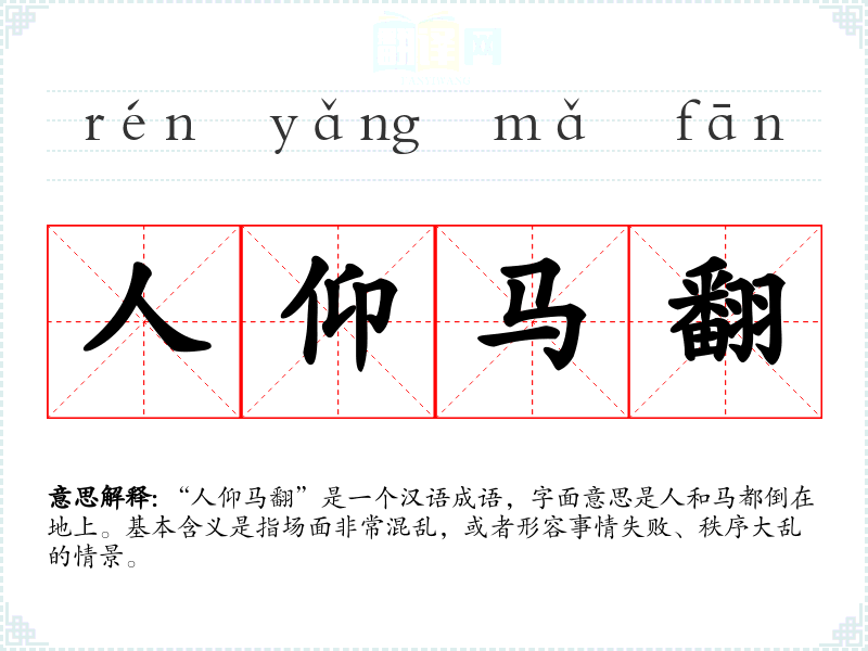 “人仰马翻”是一个汉语成语,字面意思是人和马都倒在地上。基本含义是指场面非常混乱,或者形容事情失败、秩序大乱的情景。