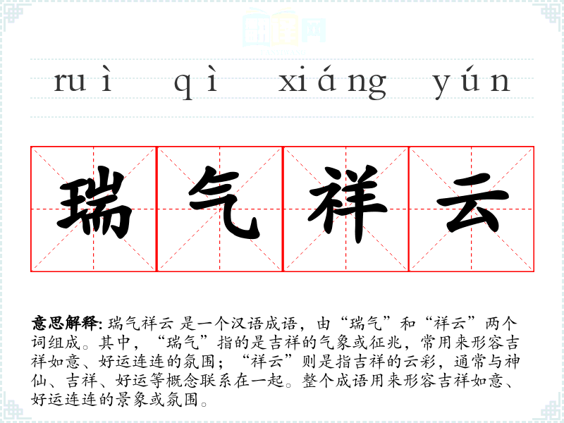 瑞气祥云 是一个充满文化内涵和美好寓意的成语。它不仅在文学和日常生活中被广泛使用,而且反映了*人对吉祥和好运的追求。在学语言和表达时,理解和运用这个成语可以帮助我们更好地理解和欣赏**文化。