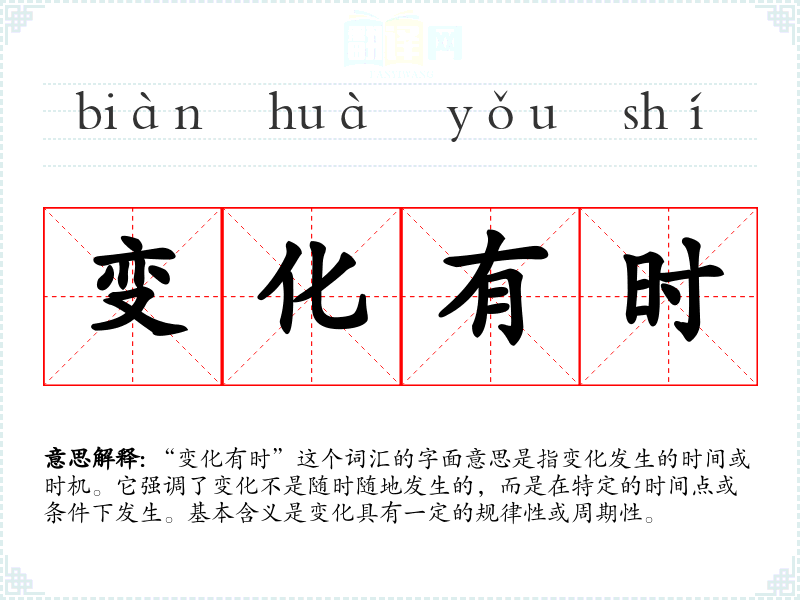 “变化有时”这个词汇的字面意思是指变化发生的时间或时机。它强调了变化不是随时随地发生的,而是在特定的时间点或条件下发生。基本含义是变化具有一定的规律性或周期性。
