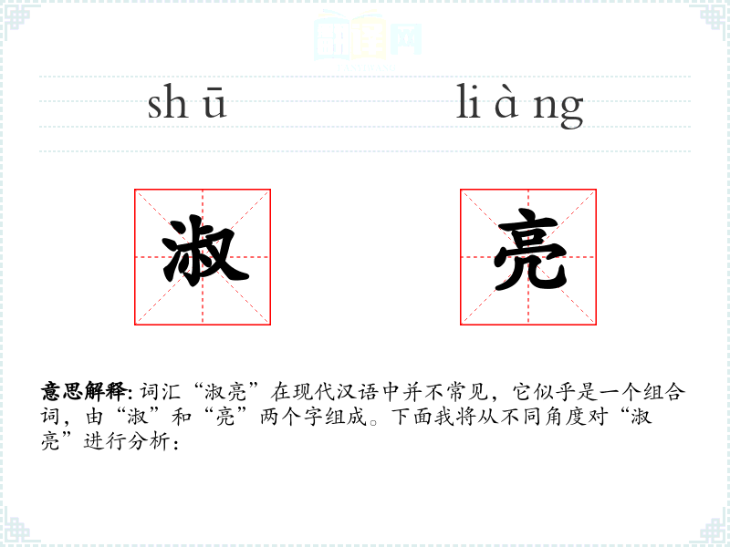 - 词源:“淑”和“亮”都是古代汉语中的常用字,但“淑亮”作为一个组合词并不常见。