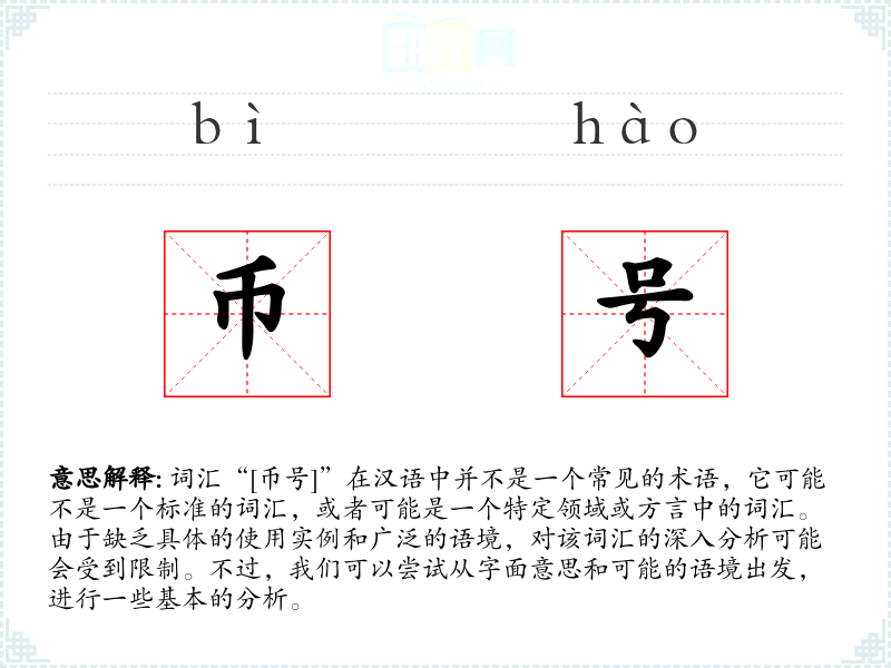 由于“币号”不是一个广泛使用的标准词汇,其词源和演变可能不为人所知。它可能是由“币”(货币)和“号”(编号)两个字组合而成的复合词。